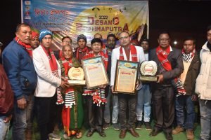 শিৱসাগৰ দিচাং ব্ৰহ্মপুত্ৰ উৎসৱৰ সামৰণি অনুস্থানত অনিল শইকীয়া আৰু ডাঃ সুৰজিৎ গিৰিক ‘গণ শিল্পী বিক্ৰম সিং য়েইন সোৱৰণী বঁটা প্ৰদান কৰা দৃশ্য।