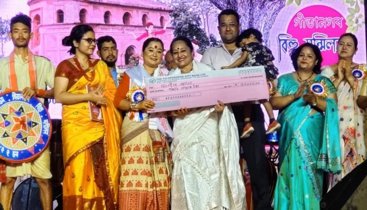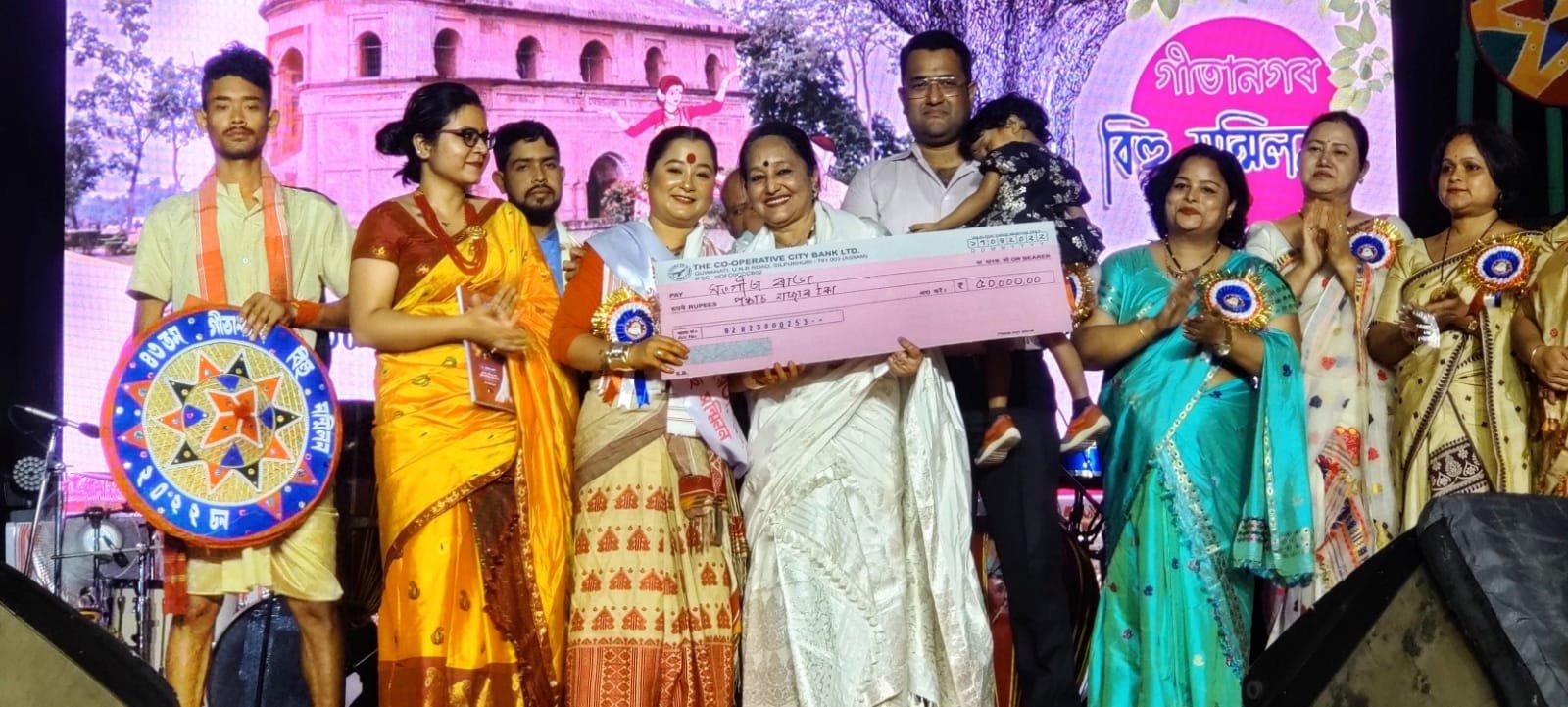 ৪৩ সংখ্যক গীতানগৰ বিহু সন্মিলন, গুৱাহাটীৰ দ্বাৰা অনুষ্ঠিত অসম বৰ বিহুৱতী প্ৰতিযোগিতাৰ চুড়ান্ত বিজয়ী অসম বৰ বিহুৱতী সংগীতা ৰাভা। ছবিত সংগীতা ৰাভাই প্ৰয়াত নয়নকুমাৰ দাস সোঁৱৰণী বঁটা আৰু নগদ ৫০,০০০টকা গ্ৰহণ কৰি থকা দেখা গৈছে।