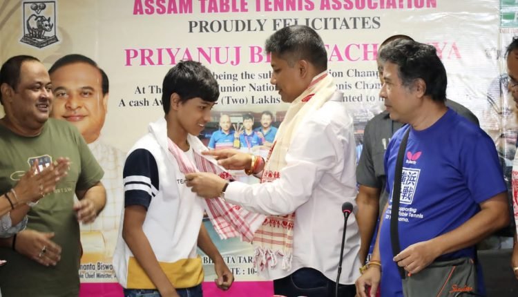শতাব্দ প্ৰতিনিধি, গুৱাহাটী,১০ জুলাইঃ তথ্য আৰু জনসংযোগ বিভাগৰ মন্ত্ৰী তথা অসম টেবুল টেনিছ সন্থাৰ সভাপতি পীযুষ হাজৰিকাই আজি দেশভক্ত তৰুণৰাম ফুকন ইন্দোৰ ষ্টেডিয়ামত আয়োজন কৰা এক অনুষ্ঠানত ২০২২ বৰ্ষৰ চাব-জুনিয়ৰ শাখাত টেবুল টেনিছৰ ৰাষ্ট্ৰীয় চেম্পিয়নশ্বিপ বিজয়ী অসমৰ খেলুৱৈ প্ৰিয়ানুজ ভট্টাচাৰ্যক সম্বৰ্ধনা জ্ঞাপন কৰে। অনুষ্ঠানত বক্তব্য ৰাখি মন্ত্ৰীগৰাকীয়ে কয় যে প্ৰায় ১০ বছৰ পাছত অসমত পুনৰ টেবুল টেনিছে ইয়াৰ পূৰ্বৰ গৰিমা ঘূৰাই পাবলৈ সক্ষম হৈছে। এসময়ত এই খেলবিধত অসমৰ খেলুৱৈয়ে যথেষ্ট ভাল প্ৰদৰ্শন কৰিছিল বুলি উল্লেখ কৰি মন্ত্ৰী হাজৰিকাই কয় যে শেহতীয়াকৈ মুখ্যমন্ত্ৰী ড০ হিমন্ত বিশ্ব শৰ্মাই ক্ৰীড়াৰ ক্ষেত্ৰত যথেষ্ট গুৰুত্ব প্ৰদান কৰাত অসমৰ ক্ৰীড়াৰ ক্ষেত্ৰখন পুনৰ উজ্জীৱিত হৈ পৰিছে। আনহাতে অসম টেবুল টেনিছ সন্থাৰ উদ্যোগত আজিৰে পৰা অসমত কলিকতাৰ প্ৰশিক্ষক শুভ্ৰজিত সাহাৰ তত্বাৱধানত এক প্ৰশিক্ষণ কাৰ্যসূচীৰো আৰম্ভ হোৱা বুলি মন্ত্ৰীগৰাকীয়ে সদৰি কৰে। আজিৰ অনুষ্ঠানত মন্ত্ৰীগৰাকীয়ে ৰাষ্ট্ৰীয় চেম্পিয়নশ্বিপৰ খিতাপ দখল কৰা খেলুৱৈ প্ৰিয়ানুজ ভট্টাচাৰ্যক শুভেচ্ছা জনোৱাৰ লগতে অসম টেবুল টেনিছ সন্থাৰ তৰফৰ পৰা দুই লাখ টকাৰ চেক প্ৰদান কৰে। আনহাতে অনাগত সময়ত অসমৰ টেবুল টেনিছ ক্ষেত্ৰখনক অধিক উজ্জীৱিত কৰিবৰ বাবে চীন দেশৰ পৰাও প্ৰশিক্ষক অনাৰ কথা চিন্তা কৰি থকা বুলি মন্ত্ৰী পীযুষ হাজৰিকাই উল্লেখ কৰে। অনুষ্ঠানত আঠবাৰকৈ ৰাষ্ট্ৰীয় টেবুল টেনিছৰ চেম্পিয়ন খেলুৱৈ কমলেশ মেহটা, অসমৰ অৰ্জুন বঁটাপ্ৰাপ্ত খেলুৱৈ মনালিছা মেহটাৰ লগতে অসম টেবুল টেনিছ সন্থাৰ অন্যান্য বিষয়ববীয়াসকল উপস্থিত আছিল।
