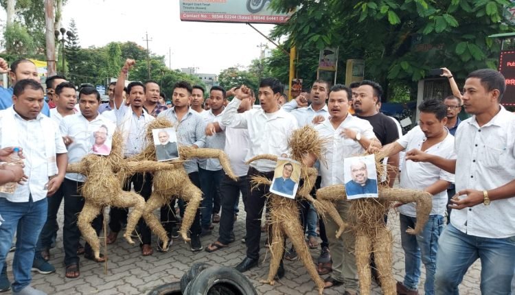 শতাব্দ প্ৰতিনিধি, তিনিচুকীয়া, ১৫ ছেপ্টেম্বৰ : কেন্দ্ৰীয় চৰকাৰে দেশৰ পাঁচখন ৰাজ্যৰ ১২ টা জনগোষ্ঠীক জনজাতিকৰণৰ মৰ্যাদা প্ৰদানৰ কথা ঘোষণা কৰাৰ পাছতে বঞ্চিত অসমৰ ছয় জনগোষ্ঠীৰ প্ৰতিবাদত আজি উত্তাল হৈ পৰে তিনিচুকীয়া ৷ আজি পুৱাৰ ভাগত সদৌ মৰাণ ছাত্ৰ সন্থা আৰু সদৌ অসম মটক যু্ৱ-ছাত্ৰ সন্মিলনে তিনিচুকীয়া চহৰৰ মাজমজিয়াৰ থানা চাৰিআলিত দেশৰ প্ৰধানমন্ত্ৰী নৰেন্দ্ৰ মোডী, কেন্দ্ৰীয় জনজাতি পৰিক্ৰমা দপ্তৰৰ মন্ত্ৰী অৰ্জুন মুণ্ডা, কেন্দ্ৰীয় গৃহমন্ত্ৰী অমিত শ্বাহ আৰু ৰাজ্যৰ মুখ্যমন্ত্ৰী ড° হিমন্ত বিশ্ব শৰ্মাৰ পুত্তলিকা দাহ কৰি তীব্ৰ প্ৰতিবাদ সাব্যস্ত কৰে ৷ প্ৰতিবাদকাৰীসকলে ’জনজাতিকৰণৰ নামত আমাক প্ৰতাৰণা নকৰিব, আমাক জনজাতিকৰণ লাগিবই, জনজাতিকৰণ আমাৰ প্ৰাপ্য, বিজেপি হায় হায়, নৰেন্দ্ৰ মোডী মুৰ্দাবাদ, অৰ্জুন মুণ্ডা হায় হায়, অমিত শ্বাহ মুৰ্দাবাদ, সৰ্বানন্দ সোনোৱাল লেই লেই চেই চেই, হিমন্ত বিশ্ব শৰ্মা গ’ বেক’ আদি শ্ল’গান দি চৌপাশ কঁপাই তোলে ৷ অসমৰ আদিম জনগোষ্ঠী মৰাণ, মটককে ধৰি ছয় জনগোষ্ঠীক কেন্দ্ৰীয় চৰকাৰে কৰা প্ৰতাৰণা কেতিয়াও সহ্য কৰা নহব আৰু ইয়াৰ পৰিণাম ভয়াবহ হ’ব বুলি প্ৰতিবাদকাৰীসকলে সকীয়াই দিয়ে ৷ নিৰ্বাচনৰ প্ৰাকমুহূৰ্তত জনজাতিকৰণৰ টোপ দি এতিয়া বঞ্চিত কৰা এইখন চৰকাৰৰ বিৰুদ্ধে ধাৰাবাহিক আন্দোলন গঢ়ি তোলাৰো হুংকাৰ দিয়ে প্ৰতিবাদকাৰীসকলে ৷ শীঘ্ৰে ৰাজ্যৰ ছয় জনগোষ্ঠীক জনজাতিকৰণৰ মৰ্যাদা প্ৰদান নকৰিলে অনাগত দিনত অসম বন্ধৰ দৰে কাৰ্য্যসূচীও গ্ৰহণ কৰিবলৈ বাধ্য হ’ব বুলি তেওঁলোকে কয় ৷ ইয়াৰ পৰৱৰ্তী সময়ত চহৰখনৰ থানা চাৰিআলিত পুনৰ সদৌ টাই আহোম ছাত্ৰ সন্থাৰ তিনিচুকীয়া জিলা সমিতিয়ে জনজাতিকৰণৰ ক্ষেত্ৰত কেন্দ্ৰীয় চৰকাৰৰ ভূমিকাত ক্ষোভ উজাৰি প্ৰধানমন্ত্ৰী নৰেন্দ্ৰ মোডী আৰু ৰাজ্যৰ মুখ্যমন্ত্ৰী ড° হিমন্ত বিশ্ব শৰ্মাৰ পুত্তলিকা দাহ কৰি উত্তাল প্ৰতিবাদ সাব্যস্ত কৰে ৷