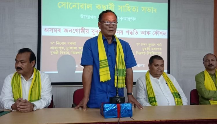 ডিব্ৰুগড়, ২৮ মেঃ ডিব্ৰুগড় বিশ্ববিদ্যালয়ত আজি সোণোৱাল কছাৰী সাহিত্য সভা আৰু সোণোৱাল জনগোষ্ঠী প্ৰণয়ন সমিতিৰ উদ্যোগত অনুষ্ঠিত হয় ‘অসমৰ জনগোষ্ঠীয় বুৰঞ্জী প্ৰণয়নৰ পদ্ধতি আৰু কৌশল’ শীৰ্ষক বক্তৃতানুষ্ঠান। সোণোৱাল কছাৰী সাহিত্য সভাৰ সভাপতি মোহন সোণোৱালৰ সঞ্চালনাত ইন্দিৰা মিৰি প্ৰেক্ষাগৃহত অনুষ্ঠিত বক্তৃতানুুষ্ঠান উদ্বোধন কৰি সোণোৱাল কছাৰী স্বায়ত্তশাসিত পৰিষদৰ উপ মুখ্য কাৰ্যবাহী সদস্য টংকেশ্বৰ সোণোৱালে আজিৰ দিনটো সোণোৱাল জনগোষ্ঠীৰ বাবে এক ঐতিহাসিক দিন বুলি অভিহিতি কৰি চলিত বৰ্ষৰ বাজেটত এই প্ৰকল্পৰ বাবে প্ৰাৰম্ভিক পুঁজি ধাৰ্য কৰাৰ লগতে অনাগত দিনত ইয়াৰ বাবে যাৱতীয় পুঁজি আগবঢ়াই যাব বুলি ঘোষণা কৰে। বুৰঞ্জী প্ৰণয়ন সমিতিৰ মুখ্য সম্পাদক তথা ডিব্ৰুগড় বিশ্ববিদ্যালয়ৰ যুটীয়া শৈক্ষিক বিনোদ বড়াই বিষয়টোৰ সম্পৰ্কত প্ৰস্তুত কৰা পৰিকল্পনাৰ আভাস দাঙি ধৰে। সমল ব্যক্তি হিচাপে অংশগ্ৰহণ কৰি বিষয়টোৰ বিভিন্ন দিশ বিশ্লেষণ কৰে ডিব্ৰুগড় বিশ্ববিদ্যালয়ৰ বুৰঞ্জী বিভাগৰ প্ৰাধ্যাপক ড॰ নিৰোদ কুমাৰ বৰুৱা আৰু একে বিভাগৰে মুৰব্বী অধ্যাপক ড॰ চন্দন কুমাৰ শৰ্মাই। সোণোৱাল কছাৰী সাহিত্য সভাৰ মুখ্য সম্পাদক মৃদুল সোণোৱালে আদৰণি ভাষণ প্ৰদান কৰা অনুষ্ঠানটিত সভাৰ মুখ্য উপদেষ্টা গুণেশ্বৰ সোণোৱাল, বিশিষ্ট লেখক-সাহিত্যিক নন্দেশ্বৰ কছাৰী, শান্তনু দাস বৰহাজোৱাল, প্ৰশান্ত কুমৰাল, ডাঃ জীতেন বড়া, সাংবাদিক ৰতন হাজৰিকা, অধ্যাপক তুলসী সোণোৱাল, ড॰ নিতুমনি বড়া শইকীয়া, জগত হাজৰিকা, বেণু বড়া, মহানন্দ সোণোৱাল, লেখক অৰবিন্দ বড়া আদিয়ে বিষয়টোৰ সম্পৰ্কত প্ৰশ্নোত্তৰ শিতানত অংশগ্ৰহণৰ লগতে বিষয়টোৰ সম্পৰ্কত কেতবোৰ পৰামৰ্শ আগবঢ়ায় । অনুষ্ঠানত ৰাজ্যখনৰ বিভিন্ন প্ৰান্তৰ সোণোৱাল কছাৰী জনগোষ্ঠীৰ শতাধিক ব্যক্তি উপস্থিত থাকে ।