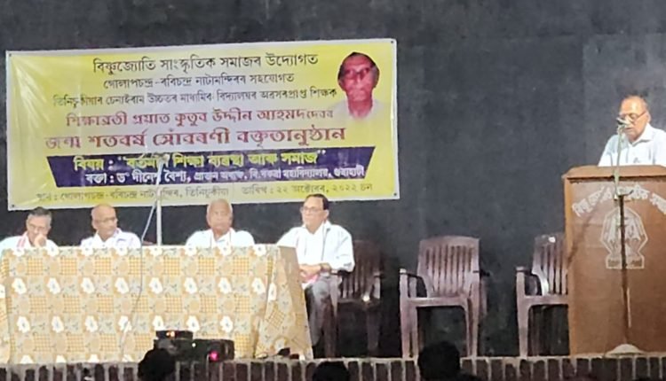 শতাব্দ প্ৰতিনিধি, তিনিচুকীয়া, ২২ অক্টোবৰ : তিনিচুকীয়াৰ বিষ্ণুজ্যোতি সাংস্কৃতিক সমাজৰ উদ্যোগত আৰু গোলাপচন্দ্ৰ-ৰবিচন্দ্ৰ নাট্যমন্দিৰৰ সহযোগত আজি চেনাইৰাম উচ্চতৰ মাধ্যমিক বিদ্যালয়ৰ অৱসৰপ্ৰাপ্ত শিক্ষক প্ৰয়াত কুতুবউদ্দীন আহমদৰ জন্ম শতবৰ্ষ সোঁৱৰণী বক্তৃতানুষ্ঠানৰ আয়োজন কৰা হয় ৷ সাহিত্য-সংস্কৃতি, ক্ৰীড়া তথা সামাজিক উত্তৰণৰ বাবে অহোপুৰুষাৰ্থ কৰি যোৱা শিক্ষাব্ৰতী প্ৰয়াত কুতুবউদ্দীন আহমদক জন্ম শতবৰ্ষত সোঁৱৰণ কৰাৰ অৰ্থে স্থানীয় গোলাপচন্দ্ৰ-ৰবিচন্দ্ৰ নাট্যমন্দিৰত আয়োজিত এই বক্তৃতানুষ্ঠানত বক্তৃতাৰ বিষয় আছিল ’বৰ্তমান শিক্ষা ব্যৱস্থা আৰু সমাজ’ ৷ সাম্প্ৰতিক সময়ৰ নিতান্তই এক জ্বলন্ত বিষয়ত অনুষ্ঠিত বক্তৃতানুষ্ঠানত বক্তাৰূপে গুৱাহাটীৰ বি বৰুৱা মহাবিদ্যালয়ৰ অৱসৰপ্ৰাপ্ত অধ্যক্ষ, শিক্ষাবিদ তথা সাম্প্ৰতিক শিক্ষা ব্যৱস্থাৰ বস্তুনিষ্ঠ সমালোচক ড° দীনেশ বৈশ্য উপস্থিত থকাৰ কথা আছিল যদিও তেখেত হঠাতে অসুস্থ হৈ পৰাত আজিৰ কাৰ্য্যসূচীত অংশগ্ৰহণ কৰিব নোৱাৰে ৷ সেইবাবে তেখেতে প্ৰেৰণ কৰা বক্তৃতা অনুষ্ঠানত পাঠ কৰে বিষ্ণুজ্যোতি সাংস্কৃতিক সমাজৰ সম্পাদক পূৰ্ণ কাকতিয়ে ৷ ইয়াৰোপৰি ড° বৈশ্যৰ বক্তৃতা ছপা আকাৰে উপস্থিত ৰাইজৰ মাজত বিতৰণ কৰা হয় ৷ উল্লেখ্য যে তিনিচুকীয়াৰ এই সৰ্বজন সন্মানীয় সৰলমনা ব্যক্তি, অভিনেতা, নাট্যকাৰ, ক্ৰীড়াবিদ, ’তথ্যজ্যোতি’ উপাধিৰে বিভূষিত অতীত তিনিচুকীয়াবিদ, কবি, গীতিকাৰ, প্ৰাবন্ধিক, সু-বক্তা তথা আজীৱন শিক্ষাব্ৰতী প্ৰয়াত কুতুবউদ্দীন আহমদৰ জীৱনধাৰা প্ৰতিফলিত কৰিব পৰাকৈ বিভিন্নজনৰ তথ্যসমৃদ্ধ লেখাৰে সমৃদ্ধ এখনি স্মৰণিকা প্ৰবীন শিক্ষাবিদ পূৰ্ণানন্দ বৰুৱাৰ সম্পাদনাত প্ৰকাশ কৰা হয় । আজিৰ অনুষ্ঠানত বিষ্ণুজ্যোতি সাংস্কৃতিক সমাজৰ সভাপতি ড° জ্যোতিপ্ৰসাদ চলিহা, উপ-সভাপতি অমূল্য খাটনিয়াৰ, সম্পাদক পূৰ্ণ কাকতি প্ৰমুখ্যে বিষয়ববীয়াসকলৰ উপৰি ভালেসংখ্যক লোক উপস্থিত থাকে ৷