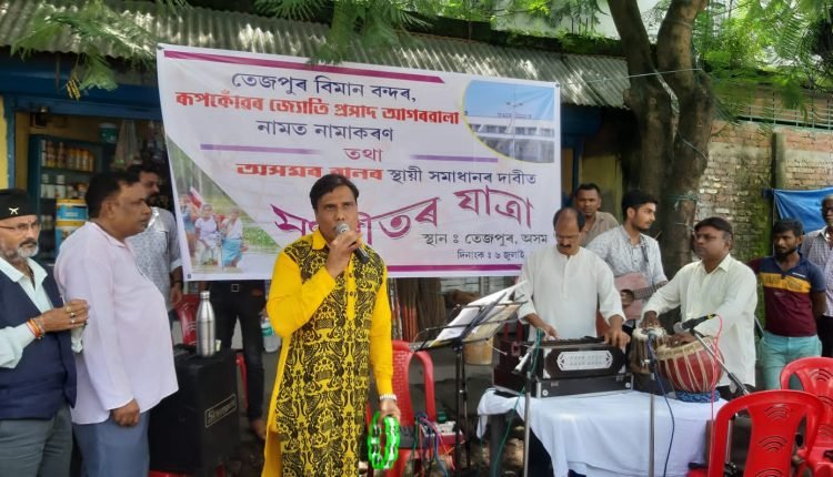 শতাব্দ প্ৰতিনিধি তেজপুৰ ,৬জুলাই: আজি দিনৰ ১২.৩০ বজাত তেজপুৰৰ ঐতিহাসিক বান থিয়েটাৰ চৌহদত ৰাজ্যৰ বান সমস্যাৰ স্থায়ী সমাধান তথা তেজপুৰ বিমান বন্দৰ ৰূপ কোঁৱৰ জ্যোতি প্রসাদ আগৰৱালাৰ নামত নামকৰনৰ দাবীত এক সংগীতৰ যাত্রা কার্যসূচী ৰূপায়ন কৰা হয় ।এই অনুষ্ঠানত সংগীতৰ যাত্ৰাৰ আহ্বায়ক সন্দীপ চমৰীয়াই গীতৰ দ্বাৰাই এইক্ষেত্ৰত সজাগতা সৃষ্টিৰ লগতে ৰাজহুৱা আহ্বান জনায় । বছৰি ৰাজ্যখনক বানে কেনেদৰে বিপৰ্যস্ত কৰিছে সেই বিষয়েও গীতৰ জৰিয়তেই প্ৰকাশ কৰি তেওঁ এই বৃহৎ সমস্যাৰ স্থায়ী সমাধানৰ পোষকতা কৰে। একেদৰেই ৰাজ্যৰ সাংস্কৃতিক ক্ষেত্ৰখনত নিজস্ব চিন্তা চেতনাৰে অৱদান আগবঢ়াই অহা অপৰূপ আগৰৱালায়ো এই কাৰ্যসূচীত অংশ লৈ সংগীতৰ যাত্ৰাৰ আহ্বানক ৰাইজৰ মাজলৈ নিয়াৰ প্ৰয়াস কৰে।