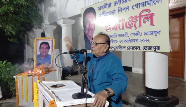 শতাব্দ প্ৰতিনিধি তেজপুৰ , ২৭ অক্টোবৰঃ ৰাজ্যক চলচ্চিত্ৰ জগতৰ এগৰাকী চিৰসেউজ অভিনেতা নিপন গোস্বামীৰ পৰলোকপ্ৰাপ্তিত ৰাজ্যখনৰ লগতে ওপজা স্হান, সংস্কৃতিৰ নগৰী তেজপুৰত শোকৰ ছাঁ পৰিছে। ১৯৪২ চনৰ ২ছেপ্তেম্বৰত তেজপুৰ কলিবাৰীৰ সংস্কৃতিবান পৰিয়ালত জন্মগ্ৰহণ কৰা আৰু অসমীয়া চলচ্চিত্ৰজগতৰ মহীৰূহ সদৃশ অতি জনপ্ৰিয় অভিনেতা গৰাকীয়ে জন্ম সূত্ৰেই পিতৃ মঞ্চকোঁৱৰ চন্দ্রধৰ গোস্বামীৰ জৰিয়তে যেন এক দূৰন্ত অভিনয় প্ৰতিভা লৈহে জন্ম গ্ৰহণ কৰিছিল। ৭ – ৮ বছৰ বয়সতে “লাচিত বৰফুকন” নামৰ নাটকত অভিনয় কৰি দক্ষতাৰ পৰিচয় দিয়াৰ পিছৰ পৰা যেন আৰু পিছলৈ উভতি চাব লগা হোৱা নাছিল। স্নাতক ডিগ্ৰী গ্ৰহণ কৰাৰ পিছতেই পুণেৰ ভাৰতীয় চলচ্চিত্ৰ আৰু দূৰদৰ্শন প্ৰতিষ্ঠানৰ প্ৰশিক্ষণৰ বাবে ঢাপলি মেলা নিপন গোস্বামীয়ে “সংগ্ৰাম”, “ডক্টৰ বেজবৰুৱা, শেষ বিচাৰ, আজলী নবৌ, ককা দেউতা নাতি আৰু হাতী, নয়ন মণি, জীৱন সুৰভি, প্ৰতিমা, শকুন্তলা আৰু শংকৰ জোচেফ আলি, দূৰণিৰ ৰং, চিৰাজ, ব’হাগৰ দুপৰীয়াকে ধৰি শতাধিক চলচ্চিত্ৰত দক্ষতাৰে অভিনয় কৰি অসমীয়া দৰ্শকৰ হৃদয় জিনিবলৈ সক্ষম হৈছিল।সেইখিনি সময়তে পুণেৰ প্ৰতিষ্ঠানত সুভাষ ঘাই, শত্ৰুঘ্ন সিনহা, নবীন নিশ্চল, জালাল আগা, ৰাকেশ পাণ্ডে আদিক সহপাঠী হিচাপে পোৱা তেজপুৰ কলিবাৰীৰ বিখ্যাত বাসগৃহটিৰ পৰাই অভিনয় ক্ষেত্ৰখনত একানপতীয়াকৈ লাগি পৰা এইগৰাকী অতি জনপ্ৰিয় অভিনেতাই তেজপুৰ কলিবাৰী নিম্ন বুনিয়াদী বিদ্যালয়ৰ পৰা প্ৰাথমিক শিক্ষা, তেজপুৰ চৰকাৰী উচ্চতৰ মাধ্যমিক বিদ্যালয়ৰ মাধ্যমিক শিক্ষা আৰু দৰংমহাবিদ্যালয়ৰ পৰা স্নাতক ডিগ্ৰী গ্ৰহণ কৰি ঢাপলি মেলিছিল পুণেলৈ। অসমীয়া চলচ্চিত্ৰৰ লগতে কহিনুৰ, আৱাহন, হেঙুল, শকুন্তলা আদি ভ্ৰাম্যমাণ থিয়েটাৰতো অভিনয় কৰা নিপন গোস্বামীয়ে ভ্ৰাম্যমাণৰ মঞ্চত কৰা “অসীমত যাৰ হেৰাল সীমা” ৰ চন্দনৰ চৰিত্ৰৰ অভিনয়ৰ সাৱলীলতা আজিও দৰ্শকৰ অন্তৰত সাচ বহি আছে। ১৯৫৭ চনত মুক্তি লাভ কৰা ফণী শৰ্মা পৰিচালিত “পিয়লি ফুকন” চৰিত্ৰত অভিনয় কৰাৰ সময়ত পিতৃ চন্দ্রধৰ গোস্বামীয়ে কৰিছিল নামভূমিকাত অভিনয়।