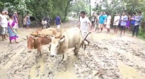 শতাব্দ ষ্টাফ ৰিপ’ৰ্টাৰ, লখিমপুৰ ৩১ মেঃ এইবাৰ পথাৰত নহয় পথত হাল বাই কঠিয়া ৰুলে ৰাইজে৷ জৰাজীৰ্ণ পথৰ দুৰৱস্থাত অতিষ্ঠ হৈ এনেদৰে প্ৰতিবাদী কাৰ্যসূচী গ্ৰহণ কৰিবলৈ বাধ্য হ’ল লখিমপুৰ জিলাৰ কদম গুজিয়লাৰ মিচিং গাঁওবাসীয়ে৷ আজি পুৱাই পথাৰৰ পৰিৱৰ্তে গাঁওখনৰ লোকসকল ওলাই আহি জৰাজীৰ্ণ আৰু বোকাময় হৈ পৰা কদম গুজিয়লাত এনেদৰে ভূঁই ৰুই প্ৰতিবাদ কৰি জনপ্ৰতিনিধি তথা প্ৰশাসনৰ দৃষ্টি আকৰ্ষণৰ চেষ্টা চলাই গাঁওবাসীয়ে৷ উল্লেখ্য যে পূৰ্বে ঢকুৱাখনা বিধান সভা সমষ্টিৰ অন্তৰ্গত আৰু বৰ্তমান লখিমপুৰ সমষ্টিত অন্তৰ্ভুক্ত হোৱা কদম গুজিয়লাৰ একমাত্ৰ পথটো বছৰ বছৰ ধৰি জৰাজীৰ্ণ হৈ আছে৷ এজাক বৰষুণ দিলেই ১৫ নং ৰাষ্ট্ৰীয় ঘাইপথৰ কাংকান তিনিআলিৰ পৰা কদম গুজিয়লালৈ যোৱা পথটো বোকাময় হৈ পৰাত যাতায়াতৰ অনুপযোগী হৈ পৰে৷ এই গাঁওখনত থকা তিনিখনকৈ চৰকাৰী শিক্ষানুষ্ঠানলৈ অহা যোৱা কৰা ছাত্ৰ-ছাত্ৰী, শিক্ষক-শিক্ষয়িত্ৰী আদিয়ে পথৰ জৰাজীৰ্ণতাৰ বাবে দুৰ্ভোগ ভূগি আহিছে৷ ছাত্ৰ-ছাত্ৰীসকলৰ বহুতকে অভিভাৱকে বোকোচাত লৈ শিক্ষানুষ্ঠানলৈ অনা নিয়া কৰাৰ লগতে শিক্ষকসকলেও হাফপেণ্ট পিন্ধি বিদ্যালয়লৈ যোৱাৰ পিছত বিদ্যালয়ত পুনৰ কাপোৰ সলাই পাঠদান কৰিব লগা হয়৷ পথটোৰ জৰাজীৰ্ণতাৰ পৰা পৰিত্ৰাণ পাবলৈ আজি কদম গুজিয়লা মিচিং গাঁওবাসীয়ে পথত গৰুৰে হাল বোৱাৰ পিছত পুৰুষ মহিলাসকলে পথৰ মাজতে কঠিয়া তথা ভূঁই ৰুই চৰকাৰৰ বিৰুদ্ধে প্ৰতিবাদ জনায়৷ শেহতীয়াকৈ বিজেপি চৰকাৰখনে গাঁওখনক মাহীআইৰ দৃষ্টিৰে চাই অহা বুলি তেওঁলোকে অভিযোগ তুলি এইক্ষেত্ৰত লখিমপুৰৰ বিধায়ক মানৱ ডেকাৰ হস্তক্ষেপ কামনা কৰে৷