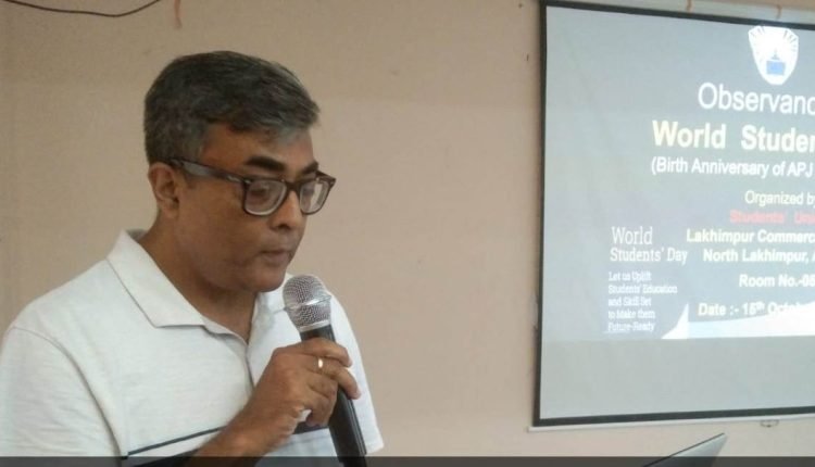 উত্তৰ লখিমপুৰঃ ১৫ অক্টোবৰঃ আন্তৰ্জাতিক ছাত্ৰ দিৱস হিচাপে উদযাপন কৰা ভাৰতৰ প্ৰাক্তন ৰাষ্ট্ৰপতি ড০ এ পি জে আব্দুল কালামৰ জন্মদিন আজি লখিমপুৰ বাণিজ্য মহাবিদ্যালয়ত উদযাপন কৰা হয়। সেই উদ্দেশ্যে আয়োজিত এক সভাত সভাপতিত্ব কৰে মহাবিদ্যালয়খনৰ অধ্যক্ষ ড০ লোহিত হাজৰিকাই। সভাৰ উদ্দেশ্য ব্যাখ্যা কৰে অসমীয়া বিভাগৰ সহকাৰী অধ্যাপক অচ্যুত কুমাৰ গগৈয়ে। সভাত নিৰ্দিষ্ট বক্তা হিচাপে উপস্থিত থাকে ইংৰাজী বিভাগৰ মুৰব্বী তথা বিশিষ্ট স্তম্ভলেখক ছাজ্জাদ হুছেইনে। ভাষণত অধ্যাপক হুছেইনে ড০ কালামৰ জীৱন আৰু কৰ্মৰাজি আৰু শিক্ষক হিচাপে তেওঁৰ বিভিন্ন অৱদানৰ ওপৰত গুৰুত্ব আৰোপ কৰি দিনটোৰ তাৎপৰ্য্যৰ ওপৰত আলোকপাত কৰে।