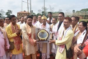 ঐতিহাসিক ৰংঘৰৰ বাকৰিত আয়োজিত সাত বিহুৰ সামৰণি অনুষ্ঠানত বিশিষ্ট লোকসংস্কৃতিৰ গৱেষক ড° অনিল শইকীয়ালৈ ২০২৩ বৰ্ষৰ স্বৰ্গদেউ প্ৰমত্ত সিংহ সাংস্কৃতিক বঁটা দিয়াৰ দৃশ্য।
