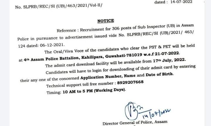 শতাব্দ প্ৰতিনিধি, গুৱাহাটী,১৫ জুলাইঃ অসম আৰক্ষীৰ উপ-পৰিদৰ্শকৰ মৌখিক পৰীক্ষাৰ দিন ঘোষণা। ২১ জুলাইত অনুষ্ঠিত হ’ব এই পৰীক্ষা। গুৱাহাটীৰ কাহিলীপাৰাস্থ চতুৰ্থ অসম আৰক্ষী বাহিনীত অনুষ্ঠিত হ’ব এই মৌখিক পৰীক্ষা। মৌখিক পৰীক্ষাৰ পূৰ্বে প্ৰাৰ্থীসকলে ডাউনলোড কৰিব লাগিব এডমিট কাৰ্ড। ১৭ জুলাইৰ পৰা ডাউনলোড কৰিব পাৰিব এডমিট কাৰ্ড। ২০২১ চনৰ ৬ ডিচেম্বৰত অনুষ্ঠিত হৈছিল ৩০৬ টা পদৰ বাবে লিখিত পৰীক্ষা। এই সন্দৰ্ভত অধিক তথ্যৰ বাবে অসম আৰক্ষীয়ে মুকলি কৰিছে এক টোলফ্ৰী নম্বৰ। টোলফ্ৰী এই নম্বৰটো হৈছে 8929207668।